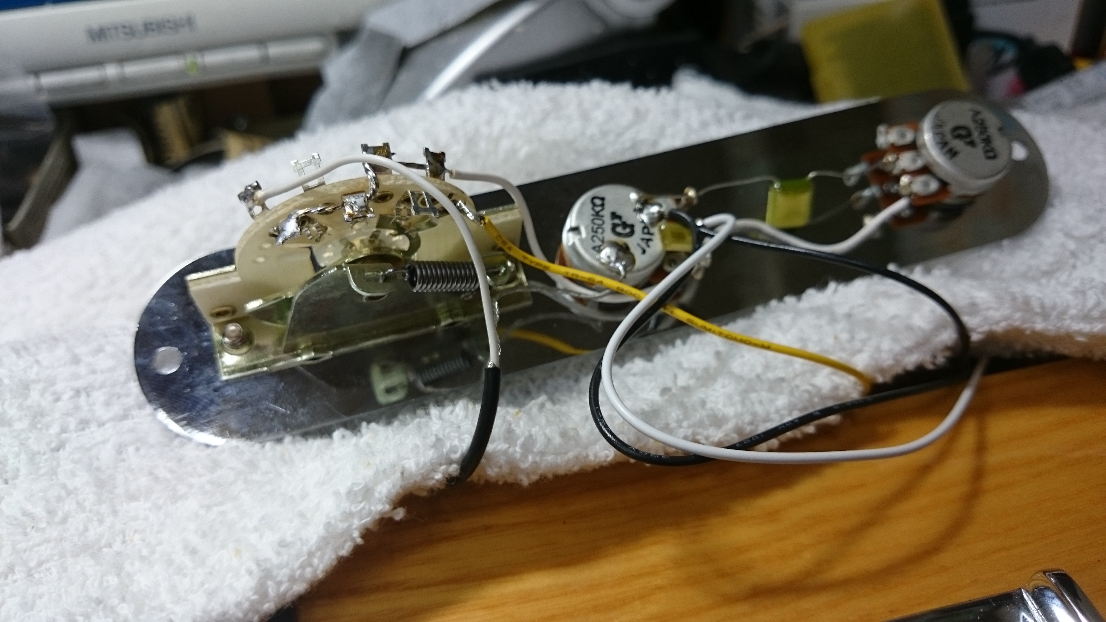 国産=物が良いのですが、電気系は国産よりも海外製が良いという逆転した分野です。細かく安いパーツに人件費が高い日本では大した物が作れない?のか、品質はあまり良くなく特に国産のPUセレクターは壊れ易いですね。丈夫なCRL製に交換しました。