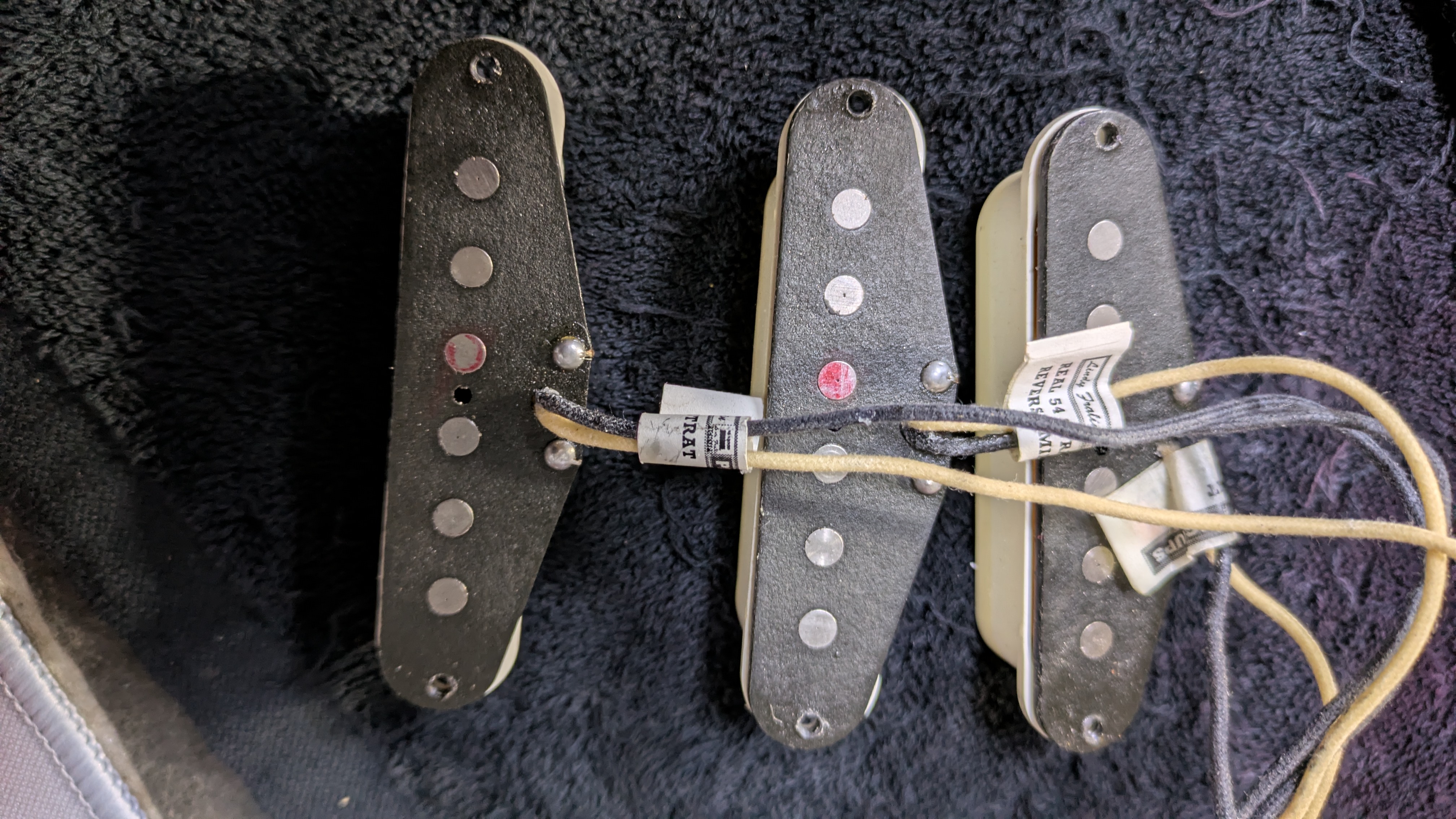 The pickguard was replaced, two potentiometers and a capacitor were swapped out, and the pickups were upgraded to Lindy Fralin Real 54s.